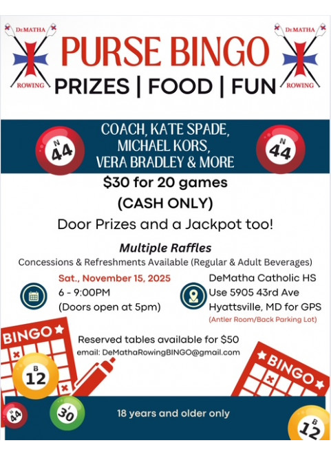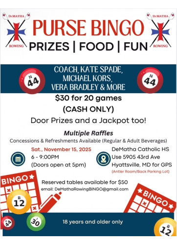 Get a reserved table for 6 at DeMatha Rowing Club's Purse Bingo on Saturday, November 15.